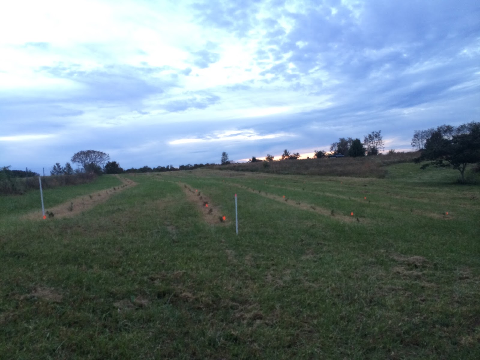 Let me start by saying it was a rough four days of working all day long. At the end of the day Jamie, my dad, and I all walked significantly slower back to our cars than we had walked out to the field in the morning. Being unable to straighten our backs and knees all the way had something to do with it, I’m sure. It took great effort to make it up the stairs to the shower once we got home. It hurt but it felt so good when at the end of each day I paused for water and to stretch my back, and I looked around for the first time–the rest of the day had been spent bending down and looking at the dirt I was packing in around the trees–and I saw all the rows of tiny green sprouts standing proud. Happiness washed over all the achy muscles, bruises, and scratches.